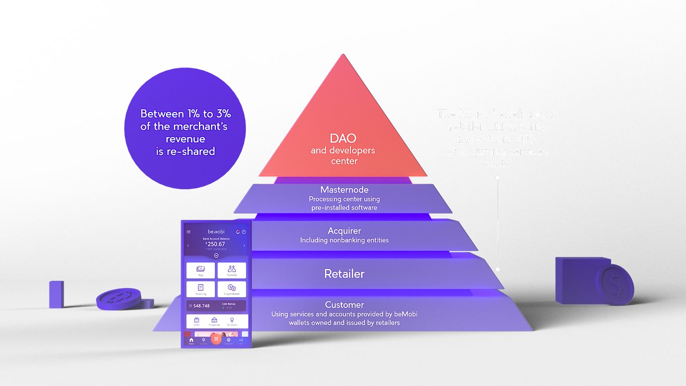 beMobi is a Decentralized Acquiring System, providing an opportunity for Non-Financial entities to enter previously privileged payment acquiring markets.